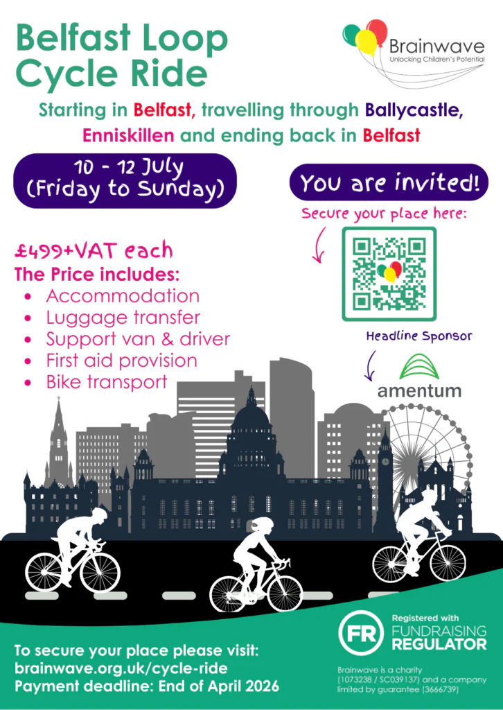 Sign up for Brainwave's Belfast Loop Cycle Ride, raising money to help children with disabilities reach their potential through specialist Therapy Programmes, designed by qualified therapists and taught to families.