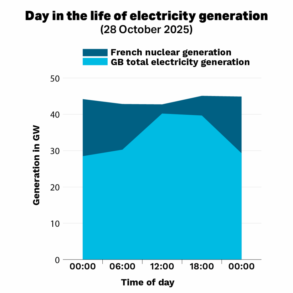 To illustrate, we looked at grid data from a single day in October. French nuclear output fluctuated between 38 and 45 GW, averaging 43 GW.[1] Britain’s total electricity generation, from all sources, ranged from 27 to 40 GW, averaging 34 GW.[2]