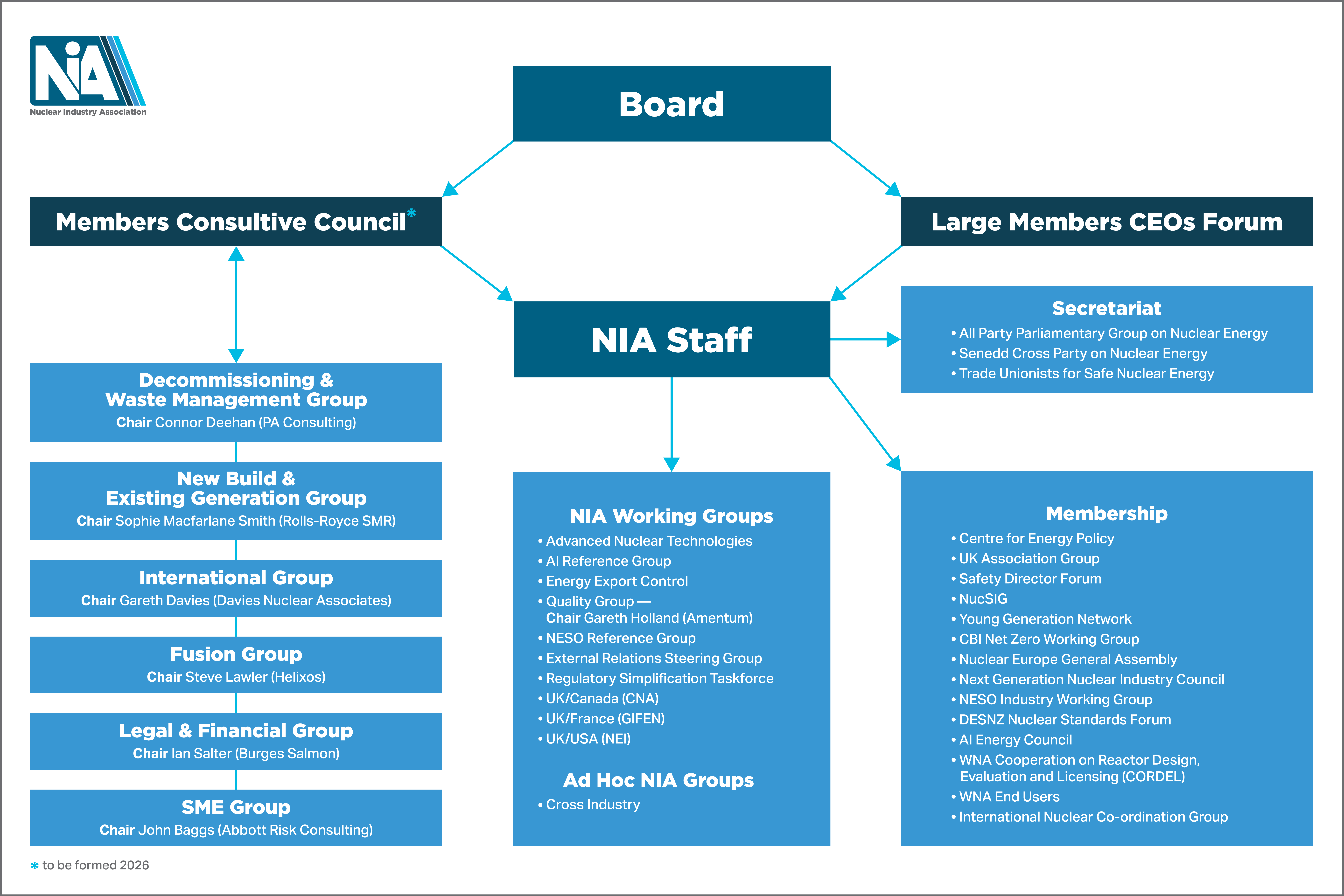 The NIA’s governance is made up of a Board of independent and member company representatives who oversee the operation, finances, staffing and organisation of the NIA. There are also two new forums that help ensure the NIA is able to be in touch with the needs and expectations of member companies – a Membership Consultative Council, which will be recruited for the first time in 2026, made up of representatives from companies across the fuel cycle – large, small and with regional balance. There is also a twice yearly Forum for the CEOs and Leaders of our larger companies. Board members will also be attendees of meetings of both of these bodies.